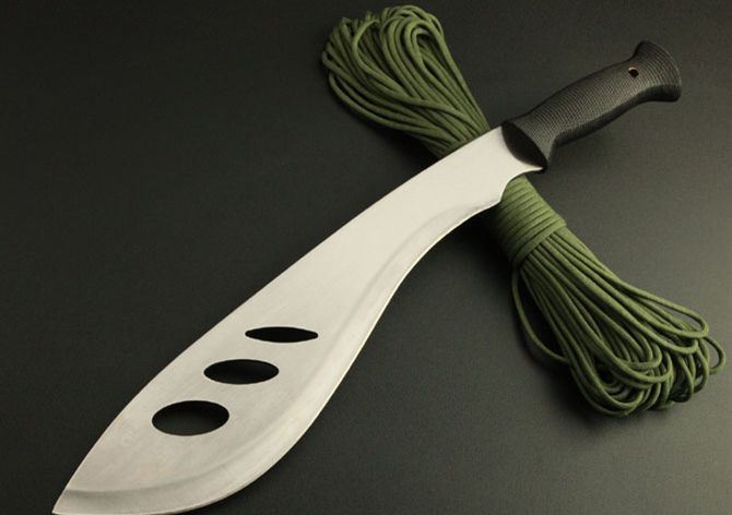 三只眼野营刀(白色) 全长: 49CM 刃长: 36CM 刃宽: 8CM (最宽处) 刃厚: 0.31CM 硬度: 55HRC 重量: 600克(含套) 材质: 420不锈钢 涂层: 砂光 柄材: ABS 刀鞘: 尼龙套