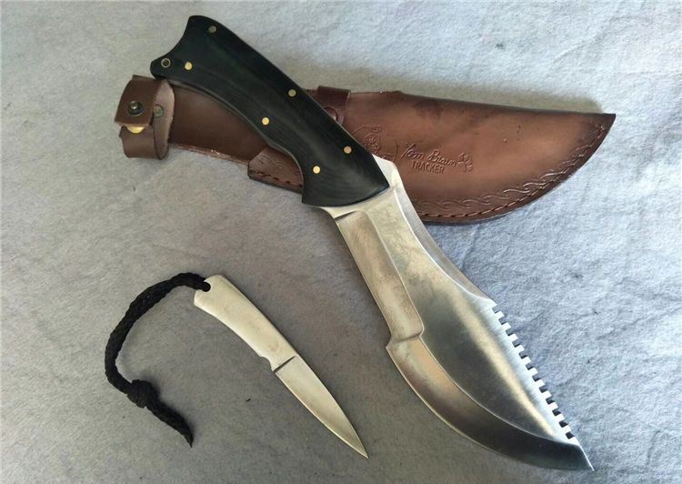 仿TOPS追踪者II号直刀钢本色 全长:34.5cm 刃长:19.5cm (分两节刀刃:圆为砍刃和平为削刃) 柄长:16cm 厚 度:6MM 刀刃最宽处:6.5CM 硬度: 57 刃材:440 米卡塔手柄 真皮鞘 刀净重:700克 鞘 重:100克 表面:丝光