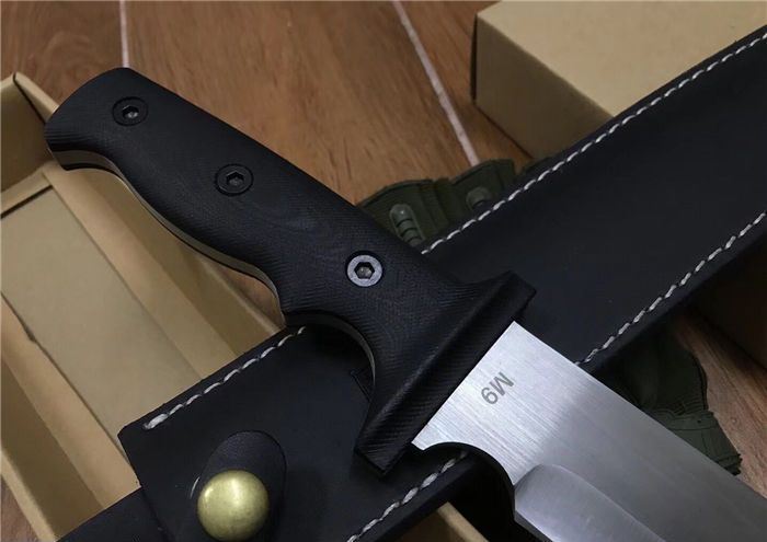 布兰登M9(白版) 全长:42cm 刃长:28.5cm 柄长:13.5cm 刃厚:5.7mm 刃宽:4cm 刃材:5Cr13 柄材:米克塔 硬度:57HRC 净重:610克 毛重:1040克 表面处理:砂光