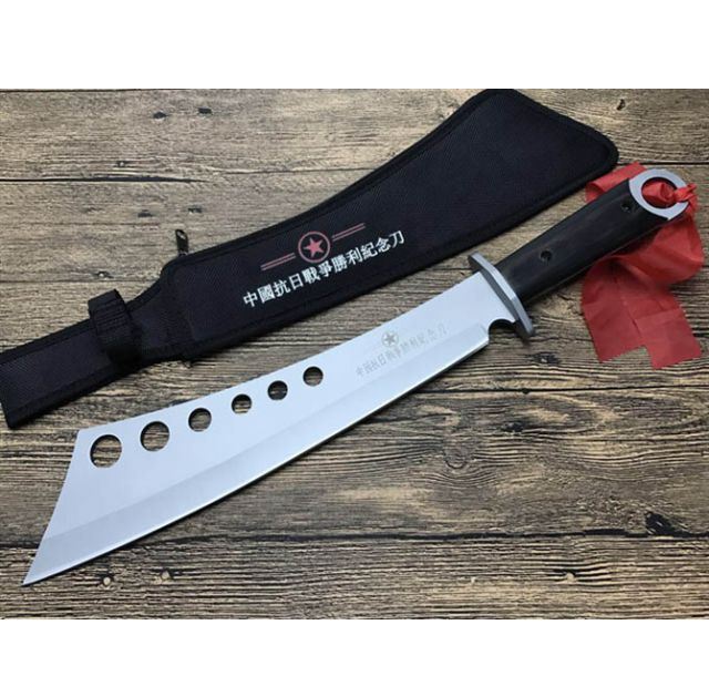 抗日战争纪念刀 全长:55cm 刃长:35.5cm 表面处理:镀灰钛 柄长:16.5cm 刃厚:4.8mm 刃宽:8cm(最宽处) 刃材:7Cr17 柄材:彩木 硬度:58HRC 重量:1000克(含尼龙套) 包装:拉链尼龙套、挂小红布