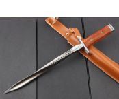 五六螺旋三棱军刺(原木柄) 全长:40CM 刃长:28.5CM 刃材料:三棱刃不锈钢,螺旋状 柄长:11CM 重量:450克 刀鞘:PU皮