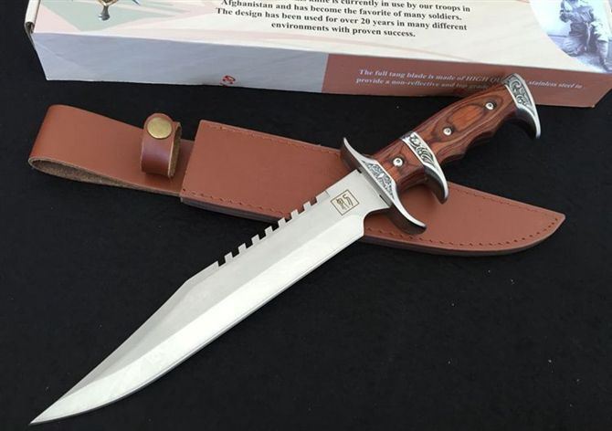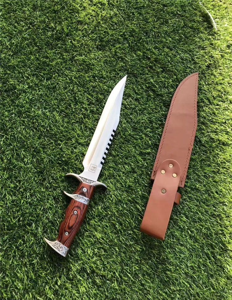 刀奴系列战斗刀 (小号) 全长:38cm 刃长:24cm 刃厚:0.80 刃材: 440高级不锈钢 硬度: 57HRC 表面:镜光 重量:1454g(含包装) 刀柄:钢头+红木 刀鞘:牛皮+纸盒