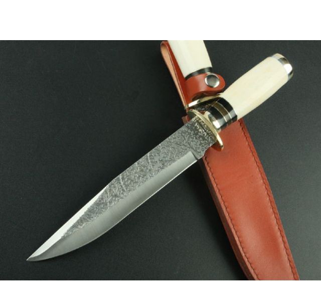锻花兽骨直刀(大号) 全长:31.8cm 刀刃:18.5cm 刃厚:0.44cm 刃宽:3.3CM 柄长:11.2cm 柄材:铜头+兽骨 硬度:57HRC 净重:400克 毛重:480克(含皮套) 表面处理:纯手工锻打