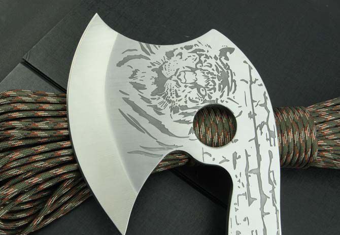 712斧头 全 长:310mm 刃 长:138mm 柄 长:140mm 刃 宽:122mm 刃 厚:5.8mm 刃 材:3Cr13Mov 重 量:770g(含包装) 硬 度:55HRC 表 面:腐蚀纹 柄 材:骨片 锁 型:定锁 其 他:配尼龙套和白盒
