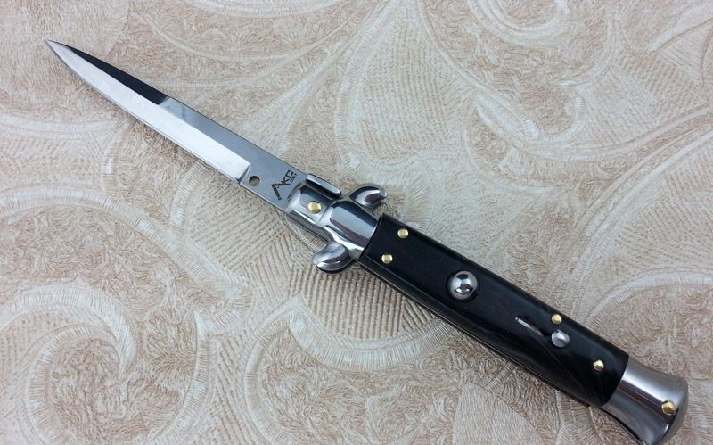 2014新款9寸AKC意大利黑手党-赌徒跳刀,在电影"教父"里出尽了风头!枪刺刃的黑手党侧跳,仿牛角亚力克柄,弹力超强,锁定到位,440枪刺刀刃镜面,带有保险装置,刀护手处暗藏闭合开关,出口产品,质量保证!满足把玩和收藏需要