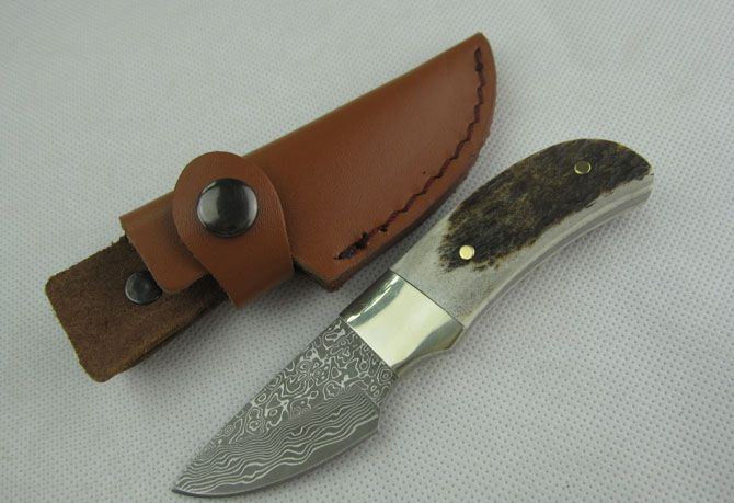 大马士革鹿角小甲虫直刀 全 长:12.5cm 刃 长:4.8cm 柄 长:7.5cm 刃 厚:2.8mm 刃 材:大马士革钢 硬 度:57HRC 刀 柄:鹿角+铜头+铜钉 表 面:大马士革花纹 重 量:80.0克 备 注:带真皮套