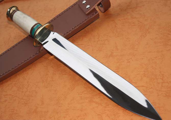 全长:42.5cm 刀刃:27.5cm 刃厚:0.35cm 刃宽:4CM 柄长:12.5cm 柄材:绿松石+铜头+兽骨 柄厚:0.3cm 刃材:7Cr17 硬度:57HRC 毛重:700克(含皮套) 表面:超镜光 结构:龙骨结构,刀身贯穿刀柄,非常牢固 、皮鞘、纸盒。 产地:国内代工