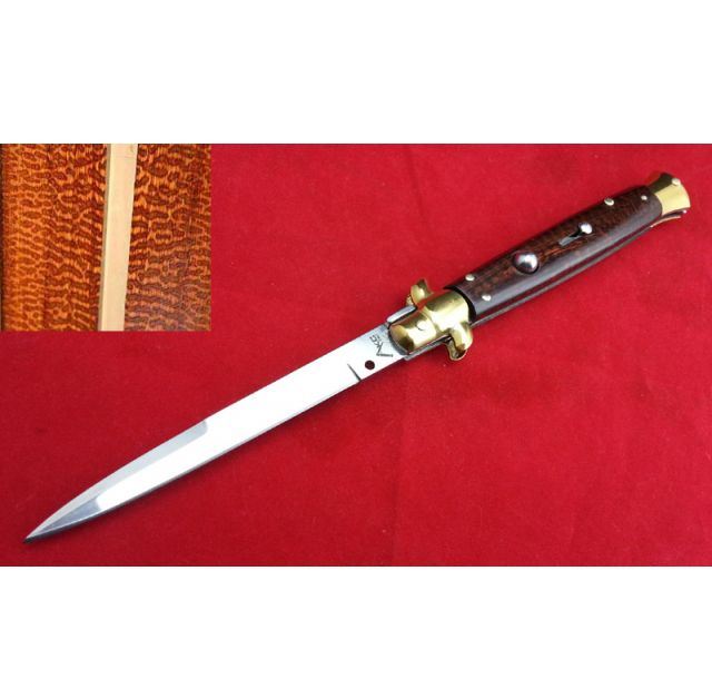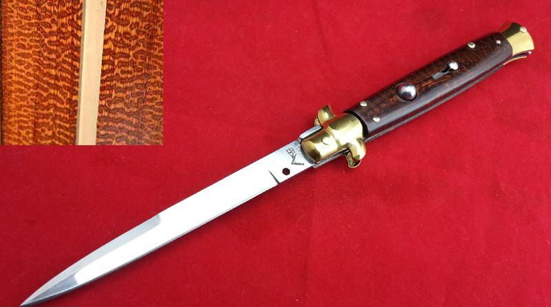 意大利黑手党使用的经典刀具-赌徒跳刀,在电影"教父"里出尽了风头!11英寸(28CM)天然蛇纹木柄(Moracea 蛇纹木,属产地:分散在南美洲亚马逊河流域附近的原始丛林中。小树冠乔木,无板根,高25m,主干15m,直径30—50bm,该树种为世界珍惜濒危保护植物,是世界上最名贵的木材之一)的黑手党侧跳,出刀迅速,锁定稳固,具有超强的穿刺力!带有保险装置,刀护手处暗藏闭合开关,AKC公司出口产品,性能优越,满足把玩和收藏的需要。
