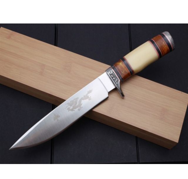 刀奴腾龙(大号) 全 长:350mm 刃 长:214mm 柄 长:134mm 刃 宽:40mm 刃 厚:5.8mm 刃 材:7Cr17 重 量:1032g(含包装) 硬 度:57HRC 表 面:砂光 柄 材:钢头+仿玉树脂 +碳纤维板 锁 型:定锁 其 他:配竹盒和皮套