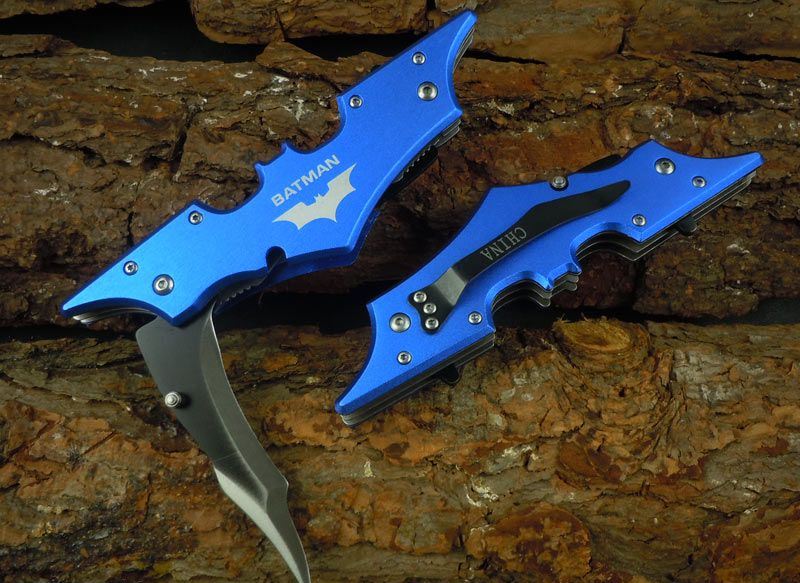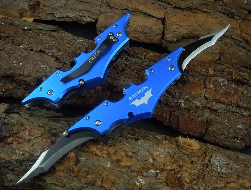 蝙蝠侠双刃战刀(蓝色、粉红色) 全长:28CM(全打开) 刃长:9CM 刃厚:0.25CM 刃材料:3铬13 柄材料:铝 重量:160克 蝙蝠侠-黑夜骑士之双刃战刀,双刃如同蝙蝠之双翅,自动打开,好莱坞经典电影蝙蝠侠收藏系列。