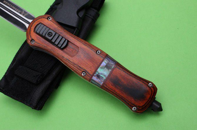 全 长:22.9cm 刃 长:9.7cm 刃 厚:1.6mm 刃 材:D2 硬 度:59HRC 刀 重:204g 毛 重:287g 表 面:镀钛 柄 材:锌铝合金+檀木+彩贝壳 刀 鞘:尼龙 锁 闭:直出弹簧刀