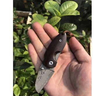 大马士革小犀牛折刀 全 长: 11.5cm 刃 长: 4.5cm 柄 长:7cm 硬 度: 59-60HRC 刃 厚: 0.3cm 重 量: 80克 表 面: 纯手工制造 柄 材: 微粒黄檀 刃 材:大马士革钢 刀刃纹路各异,以实物为准