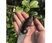 全 长: 11.5cm 刃 长: 4.5cm 柄 长:7cm 硬 度: 59-60HRC 刃 厚: 0.3cm 重 量: 80克 表 面: 纯手工制造 柄 材: 微粒黄檀 刃 材:大马士革钢 刀刃纹路各异,以实物为准