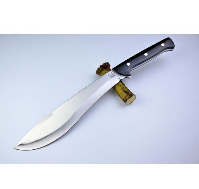 全 长: 49.8cm 刃 长: 31 刃 宽: 6.2cm(最宽处) 柄 长: 18.8cm 刃 厚: 0.6cm 刃 材: 440 硬 度: 57RHC 表 面: 丝光 柄 材: 刀身贯穿刀柄,三口坚实的钢钉铆住两面黑木 净 重: 1133克(含套) 真皮压花刀套。 品 质:高品质