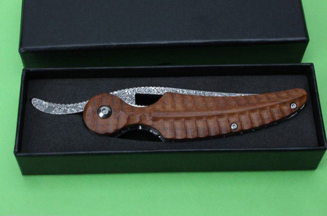 全 长:214mm 刃 长:93mm 柄 长:124mm 刃 宽:28mm 刃 厚:3mm 刃 材:大马士革 重 量:168g(含包装) 硬 度:58HRC 表 面:大马士革原纹 柄 材:绿檀木 锁 型:线锁 其 他:配皮套+礼品盒