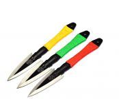 三色原始飞镖 长度:19.2cm 刃宽:2.8cm(最宽处) 刃厚:0.26cm 钢材:3Cr13Mov 柄长:8.5cm 总重:180g(含包装) 表面:喷黑色 刀套:尼龙套 其它:三支装