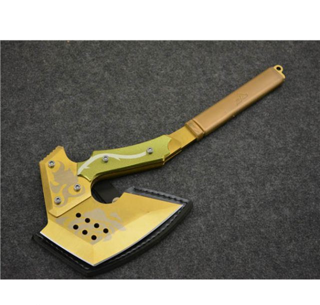 土豪金加强版穿越火线斧 全长:39cm 刃宽:16cm 刃厚:3cm 刃材:3CR13 硬度:54HRC 表面:镀钛金 柄材:ABS 柄长:17CM 净重:920克 毛重:1120克 刀鞘:仿皮套