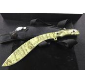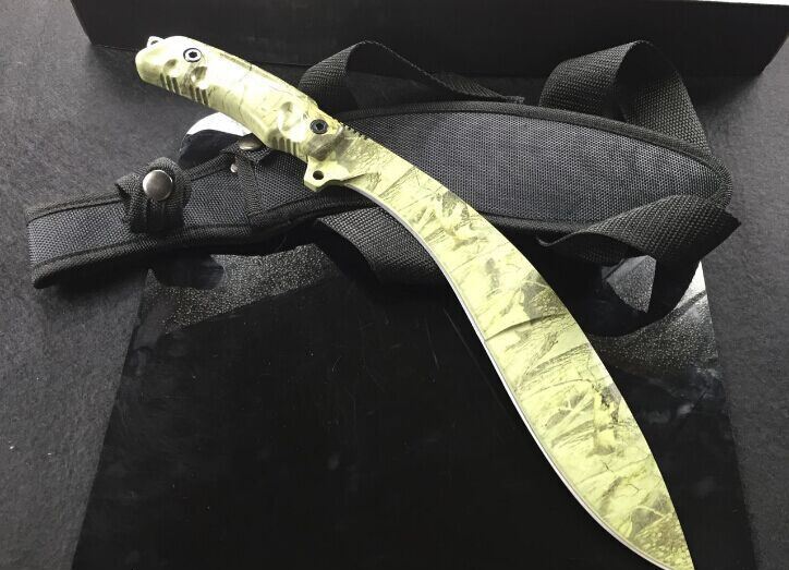 狐狸狗腿(迷彩版) 全长:39.5cm 刃长:27.5cm 刃宽:4.8cm(最宽处) 刃厚:0.5cm 刃材:440c 硬度:57HRC 表面:高温批复 柄材:橡胶 刀重:500克 总重:810克(含刀套和包装物) 附件:尼龙刀套、挂带