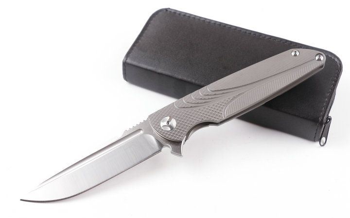 2015亚特兰大获奖刀台风折刀(灰钛D头) 全长:228mm 刃长:100mm 柄长:128mm 刃宽:25mm 刃厚:4.0mm 刃材:D2(深冷处理) 重量:245g(含包装) 硬度:58-60HRC 表面:砂光拉丝 柄材:手柄全TC4钛合金CNC加工表面雕花。 刀夹:TC4钛合金 螺丝:所有的螺丝420不锈钢硬度HRC45,全CNC精雕加工。 结构:一体线锁,陶瓷定位珠,内置双排滚珠轴承