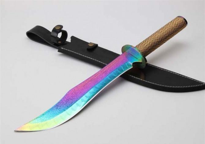 明朝总镖头大刀佩刀(彩钛版) 全 长: 57.6cm 刃 长: 36.3cm 柄 长: 21.2cm 刃 厚: 5.5mm 刃 宽: 5.6cm(最宽处) 刃 材: 420 硬 度: 57HRC 刀 重: 1399克(含包装) 表 面: 彩钛 柄 材: 钢+檀木防滑绳 结 构: 一体龙骨