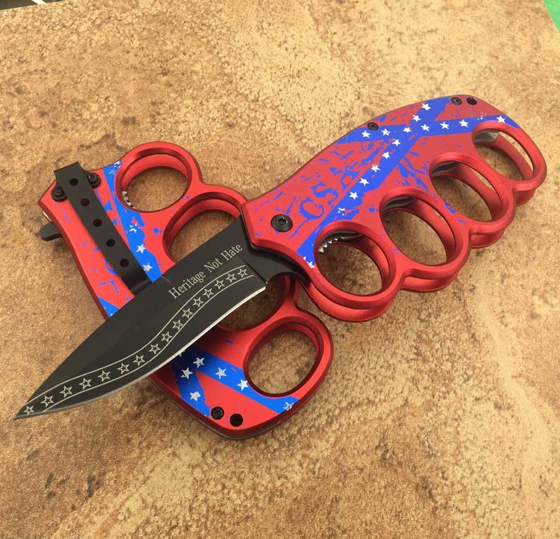 DIXIE美国联盟旗拳套折刀(助力) 全长:21CM 刀刃长:9CM 刀柄(拳套)长:12CM 柄长:6.5CM 刃材料:3铬13不锈钢 柄材:钢架+铝合金
