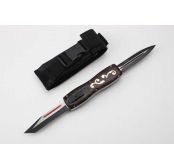 猛兽蝴蝶刀(双刀) 全 长:22.0cm 刃 长:9.3cm 刃 厚:2.2mm 刃 材:D2 硬 度:59HRC 刀 重:283g 毛 重:364g 表 面:镀钛 柄 材:锌铝合金+豹纹木 刀 鞘:尼龙 锁 闭:直出弹簧刀(双刀)