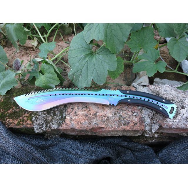 大号托德征服者狗腿刀(彩钛背齿) 全 长:39cm 刃 长:24cm 刃 宽:6cm(最宽处) 刃 厚:6.2mm 柄 长:13cm 表 面:彩钛 刃 材:5Cr15 硬 度:58HRC 柄 材:G10防滑柄片 结 构:龙骨一体贯穿整体 重 量:800克(含包装)