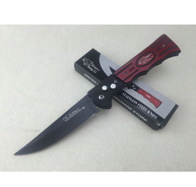 F220野狼弹簧跳刀 全 长:22cm 刃 长:9.5cm 刃 宽:2.4cm 刃 厚:2mm 刃 材:420 硬 度:56HRC 表 面:发黑 柄 材:不锈钢+铝材 重 量:180g(含包装)