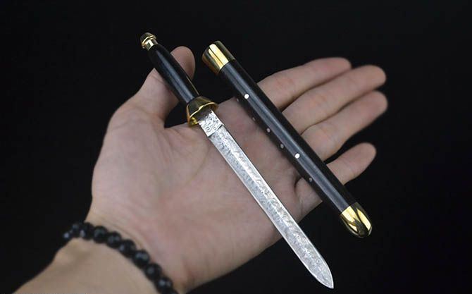 超迷你七星剑大马士革刀 全 长:17cm 刃 长:9.8cm 刃 宽:1cm(最宽处) 刃 厚:2.1mm 柄 长:5cm 表 面:大马士革纹 刃 材:大马士革钢 硬 度:59HRC 柄 材:黑檀木 重 量:112克(含包装) 刀 鞘:黑檀木