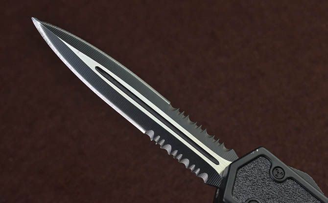 微技术黑蚁直出弹簧刀(黑色半齿) 全 长: 21.5cm 刃 长: 8cm 刃 厚: 2.5mm 刃 宽: 1.6cm 柄 长: 12.3cm 刃 材: 440 硬 度: 57HRC 刀 重: 169g 毛 重: 255g(含包装) 表 面: 拉丝+黑刃 柄 材: 全钢+防滑沙面 刀 鞘: 尼龙套 锁 闭: 直出弹簧刀 包 装: 彩盒子、尼龙套 备 注: 带玻璃锥、腰夹