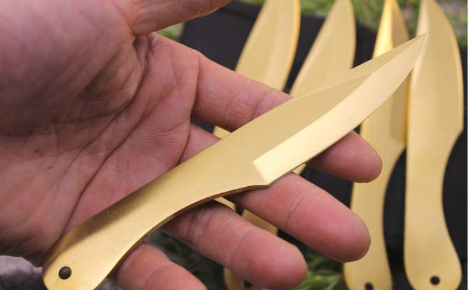 6英寸JACK RIPPER飞刀(金色6支装) 全长:15.5 刃长:7.5 刃厚:0.3 材料:3铬13不锈钢 重量:50克/支 刀鞘:牛津袋