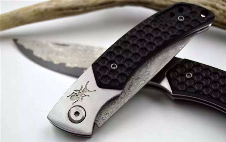 大马士革蚂蚁折刀 刃材:夹钢大马士革(芯层为VG-10) 硬度:59~60 柄材:紫光檀即黑檀(木材表面精雕蜂窝纹) 打开总长:16CM 刃厚:0.21MM 刃长:6.8CM 刃宽:2CM(最宽处) 柄长:9.2CM