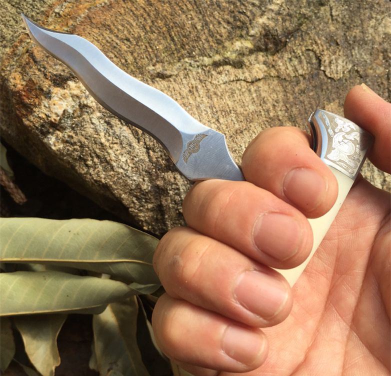 Theone 精工打造蛇形手刺,设计精美巧妙,手柄采用钢架铆牛骨片,集小直刀,手刺两用功能,超酷蛇刃! 双锋开刃! 双位锁定精确,实用性超强,配送小皮鞘