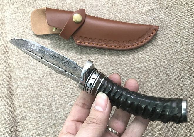 重磅推出雪花纹大马士革黑羊角猎刀,一把不可错过的收藏级猎刀,用料更是毫不吝啬,真材实料!此款刀刃是用4.2mm的雪花纹大马士革手工打造完工刃厚4.0+mm!刀刃首次镶黄铜手工雕刻火星坑,凸显尊贵不凡!柄材选用的是世上稀有的蒙古野生羊角