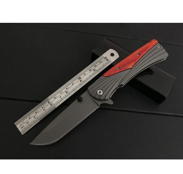 啄木鸟B026折刀 全长:21.5cm 刃长:9.2cm 柄长:12.3cm 刃厚:0.4cm 刃宽:3.5cm 刃材:5CR15MOV 柄材:全钢+酸枝木 硬度:56HRC 净重:228克 锁定:线锁 表面:镀钛 其他:原厂黑盒