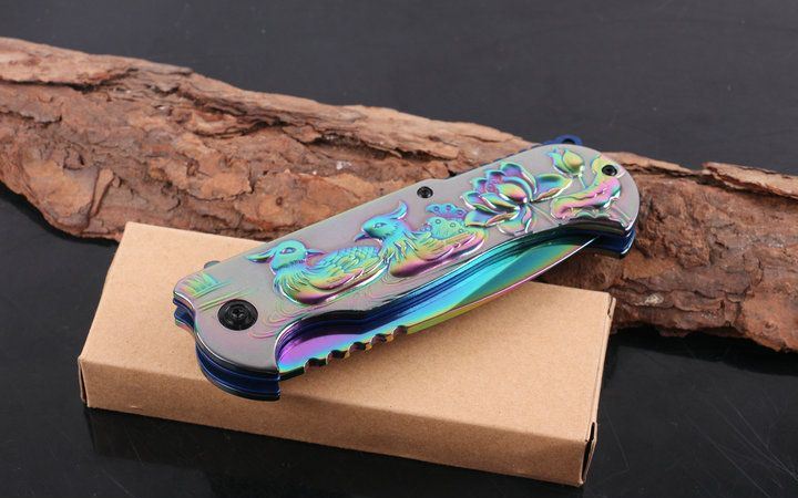 当前位置: 刀网 > 精美小刀 > 战术折刀 > 浮雕F97鸳鸯戏水折刀彩钛