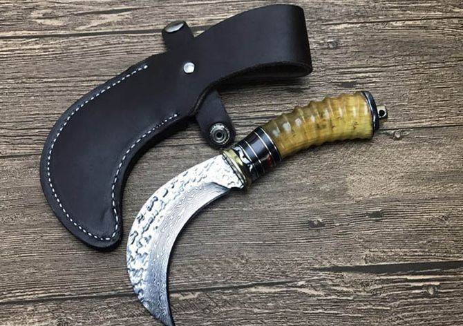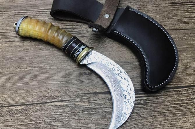 大马士革镰刀 总 长: 19.5cm 刃 长: 9.5cm 柄 长: 11cm 刃 宽: 2.9cm(最宽处) 硬 度: 59HRC 刃 厚: 0.4cm 柄 材: 野生黄羊角 重 量: 250克含包装 刃 材: 手工锻打大马士革钢 表 面: 大马士革纹 其 他: 纸盒,真皮套