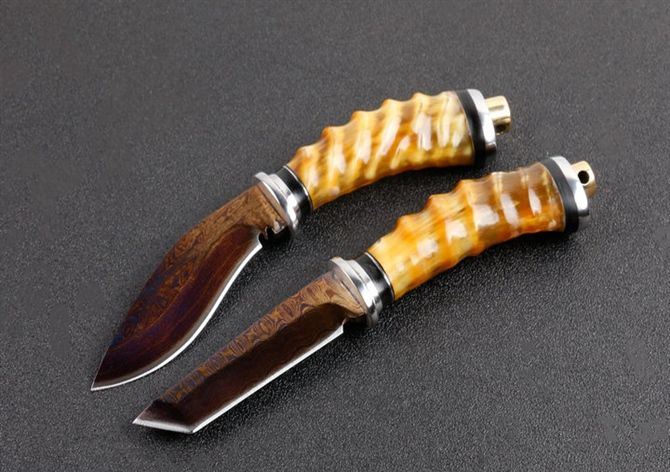 黄羊角大马士革双娇(T头版、小狗腿版) 全长:约16.5cm 刃长:8.0cm 柄长:8.5cm 刃宽:狗腿2.2cm,T头1.4cm(最宽处) 硬度:58HRC 刃厚:0.41cm 柄材:野生黄羊角+护手铜头。 重量:242克(含包装) 刃材:锻打大马士革钢,新技术镀钛工艺。 表面:大马士革钢特有的花纹原色 其他:配高档礼品盒.全手工真皮套,尾部有撞击器,两款式分T头和小狗腿,下单注明. 大马士革钢花纹和把及颜色各异,以实物为准!