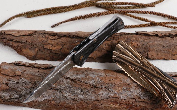 微技术终结者仿大马士革纹折刀 全长:22.2cm 刃长:9.5cm 柄长:12.8cm 刃厚:0.39cm 刃宽:2.8cm 刃材:5CR15MOV 柄材:全钢片 硬度:57HRC 净重:260克(含包装) 锁定:线锁 表面处:钛金色+彩钛两款任选,下单注明 其他:原厂灰盒