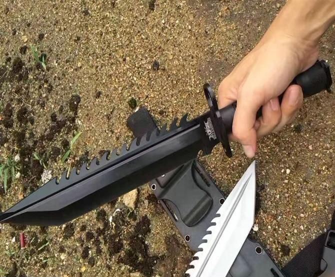 战狼军用刀加长版(白色、黑色) 全长:42.5CM 刃长:29.7CM 柄长:12.8CM 身最大宽度:4.8CM 刀厚:0.58CM 刃面:喷砂 毛重:884克(含k鞘) 钢材:7CR15钢 硬度:57 刀柄:绝缘强化塑胶