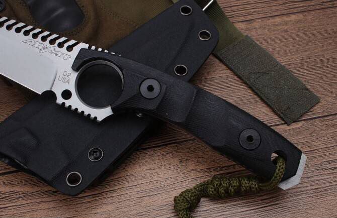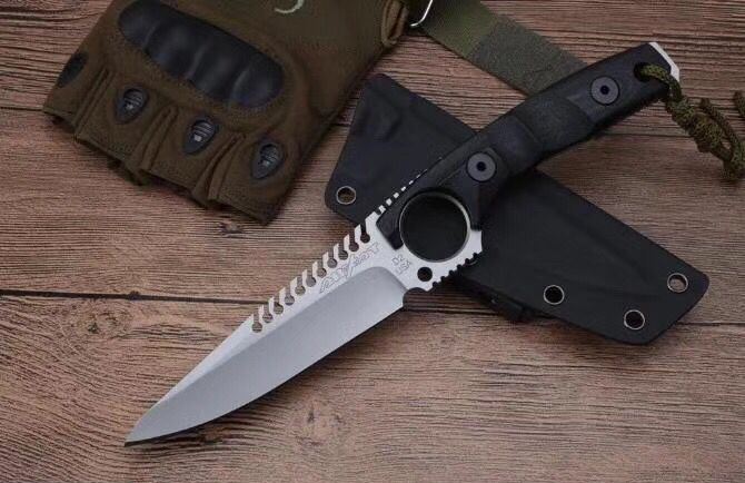 Dwaine Carrillo硬汉军刀地狱鸟直刀 材质:D2 全长:27cm 刃长:12cm 刃厚:0.5cm 刃宽:3.7cm 刀重量:300克 表面:砂光拉丝 硬度:60±1HRC(真空热处理) 手柄:黑色G10,CNC 成型 刀鞘:战术K鞘(进口Kydex板)