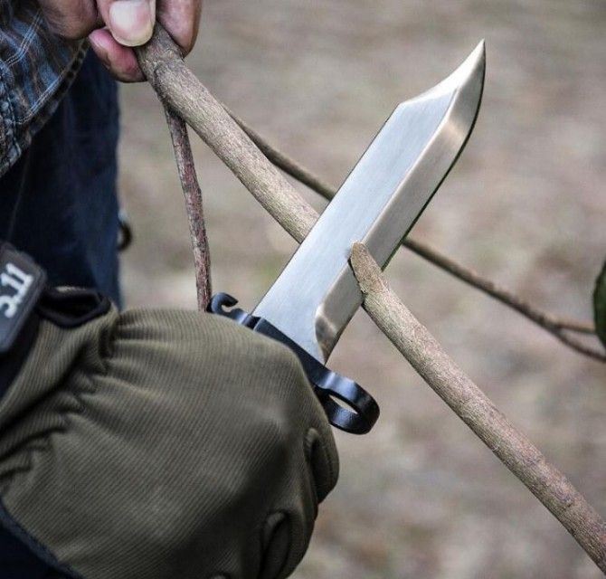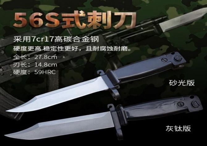 56S式刺刀 全长:27.8CM 刃长:14.8CM 刃厚:0.6CM 钢材:7CR17 柄材:ABS军用塑料 刀鞘:ABS 表面:砂光灰钛 硬度: 59HRC 重量:418g 外贸型:86S式5.56自动步枪刺刀