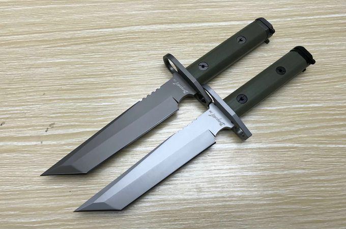 新D8军刺彩K鞘 全 长: 32cm 刃 长: 16cm 刃 宽: 3.7cm(最宽处) 柄 长: 13cm 刃 材: 8铬 硬 度: 58HRC 表 面: 钛离子 刃 厚: 0.5cm 柄 材: 龙骨结构,绿色G10柄片 总 重: 900g