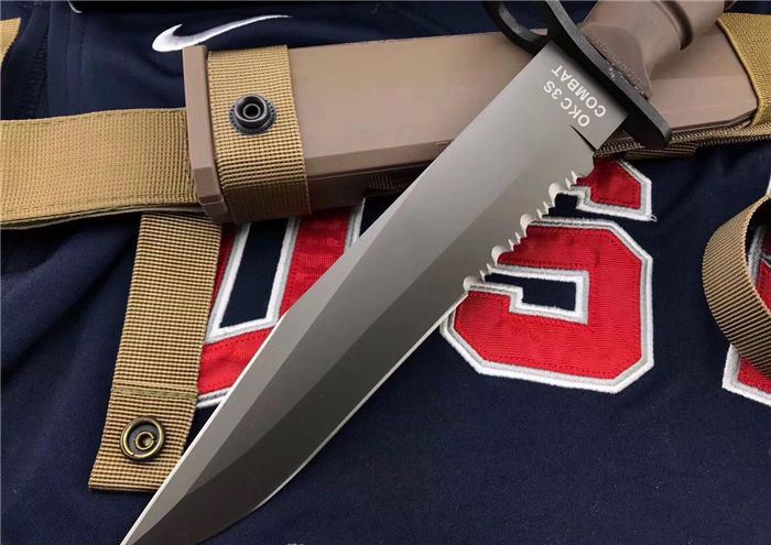 高防美军安大略M10军刺 刃材:1095高碳钢 柄材:复合弹性材料 涂层:磷酸盐消光涂层 全长:约33.7厘米 刃长:约20.3厘米 刃厚:约5.3厘米 硬度:53-58HRC 重量:约435克 刀鞘:战术刀鞘