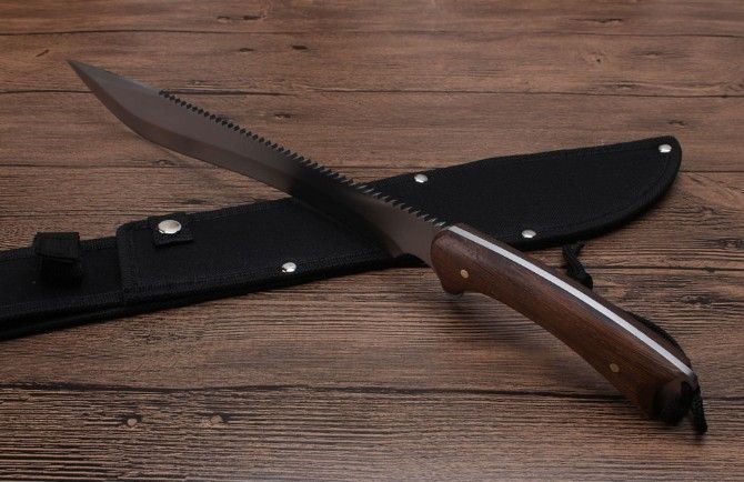 丛林探险救生刀 全长:436mm 刃长:300mm 柄长:135mm 刃宽:62mm 刃厚:0.42mm 刃材:5Cr13Wov 重量:431g(含刀套) 硬度:56HRC 表面:砂光 柄材:鸡翅木柄 锁型:定锁 其他:尼龙套