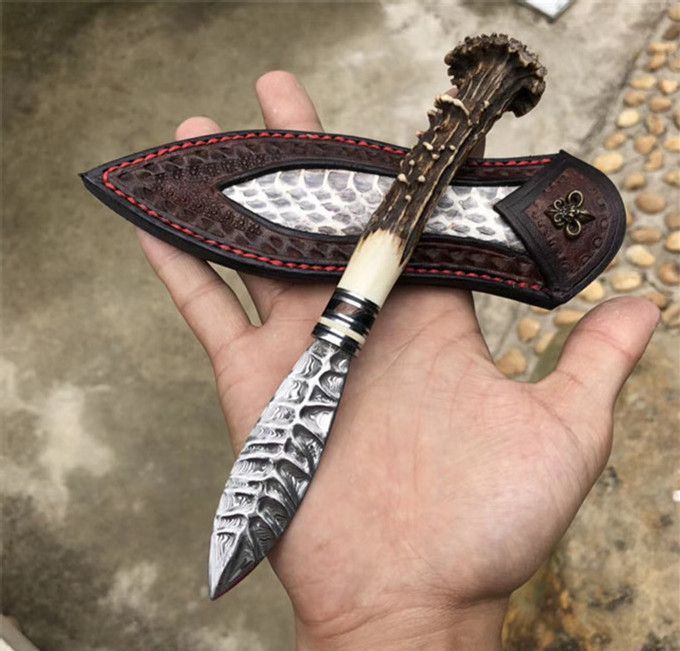 玲珑师叶枫高端手工茶刀 全长:21cm 刃长:8cm 手柄长约:13cm 刃钢材:进口大马士革钢(85层) 刃材厚度:2.5mm,硬度:60HRC 手柄材料:猛犸牙+稳定化木+孢鹿角蘑菇头 皮套:纯手工蟒蛇牛皮套