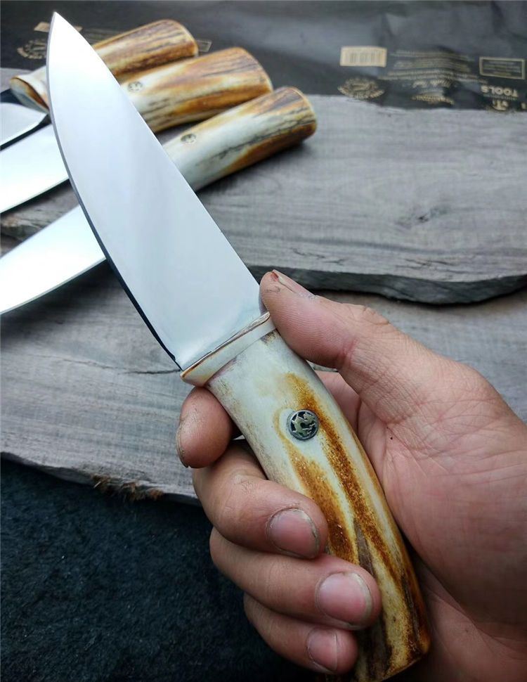 野人风系列--“逐鹿"出货,刃材采用瑞典进口的RLW34钢,果然名不虚传,不愧是世界上最好的钢材之一。柄为天然鹿角。配头层牛皮刀鞘。纯手工制作,刀刃精细打磨镜面抛光,刀柄粗犷防滑舒适,锋利、耐用。