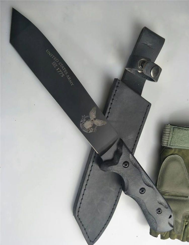 雄鹰战术直刀 全长:34cm 刃长:20cm 柄长:14.5cm 刃宽:3.5cm 刃厚:8mm 刃材:9Cr13Mov 硬度:56HRC 表面:镀钛 柄材:黑檀 其他:皮套