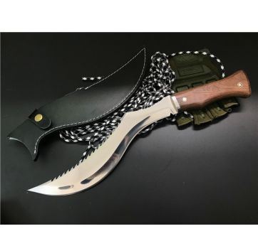 暴风战术狗腿弯刀 全长:44.5CM 刃长:30.5CM 厚度:0.5CM 刃材:7Cr17 硬度:58HRC 重量:约500g 刀面:超镜光面 柄材:鸡翅木 刀鞘:皮套