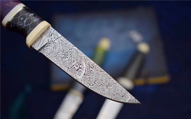 刀刃采用瑞典粉末大马士革钢制作而成,色彩亮丽,护手采用美国复合金属材料,小叶紫檀搭配猛犸牙柄中间隔片藏银 ,抛光精美,手柄采用美国复合金属材料 /染色固化稳定木,握感精细,刀鞘采用头层牛皮制作,彰显高雅,除了极具装饰性之外•瑞粉高强的防锈性能为您增添了更多实用选择,性价比高